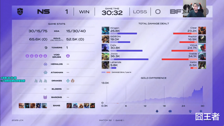 结果第一局比赛,就被NS打成了单方面的碾压局啊。比赛第3分钟左右,Gideon赵信抓中,拿下一血;比赛第4分钟左右,Gideon赵信抓下,击杀韦鲁斯;比赛第23分钟左右,BFX野区抓住落单赵信打出3换2;26分钟左右,双方争夺大龙视野爆发团战,NS打出2换3;最终比赛第30分32秒,NS五人集合推进,拿下比赛