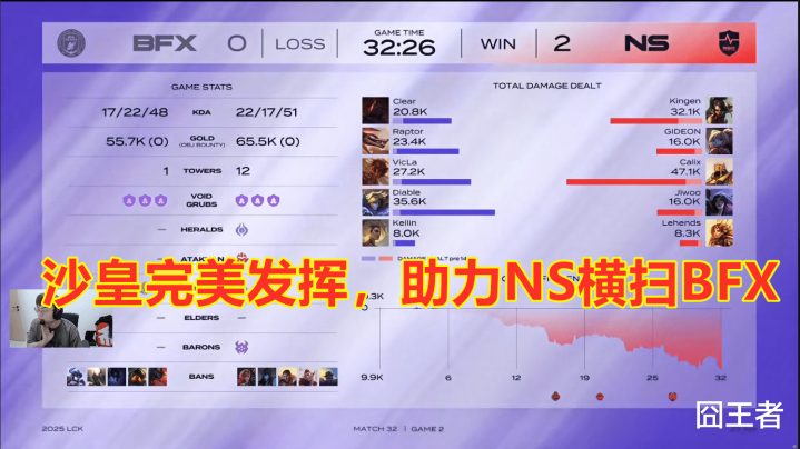 结果第二局比赛,依然是NS的单方面碾压局。比赛第6分钟左右,Calix沙皇闪现推回赵信,拿下一血;比赛第11分钟左右,双方爆发巢虫团,NS打出0换2;比赛第16分钟左右,双方爆发先锋团,NS打出2换3;比赛第18分钟左右,BFX抓住机会,中路打出0换3;比赛第27分左右,NS在率先阵亡2人下,被迫3打5,Calix完美反打,打出1换4;比赛第30分钟左右,NS大龙推进,被BFX反打,打出1换2;最终32分26秒,沙皇完美发挥,NS团灭BFX,赢下比赛。